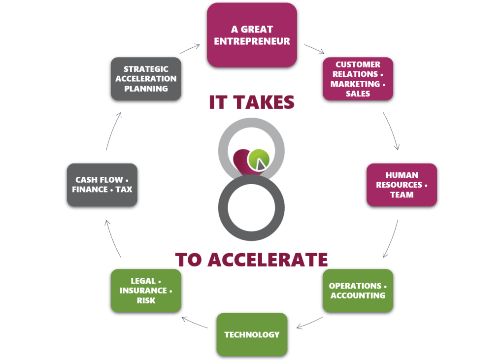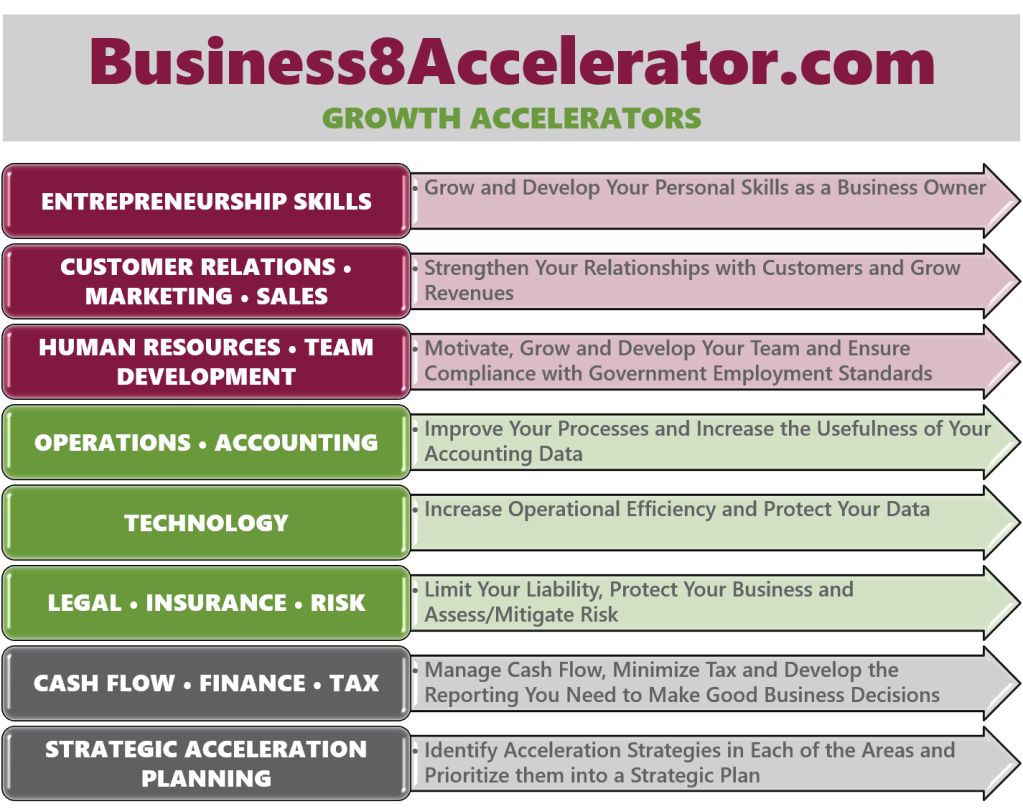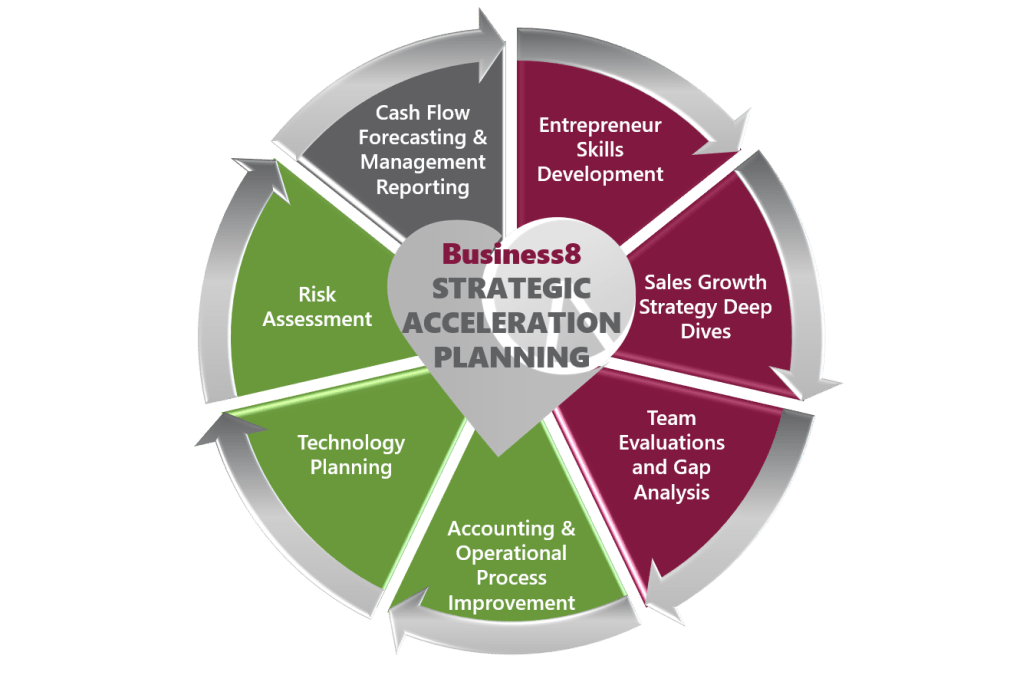 At Business8 Accelerator, we help you simultaneously GROW your revenues and STRENGTHEN your foundation in 8 areas.